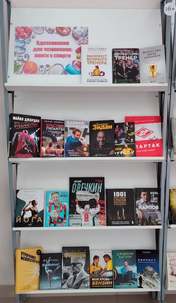 На выставке представлены книги о различных видах спорта, а также биографии великих спортсменов.